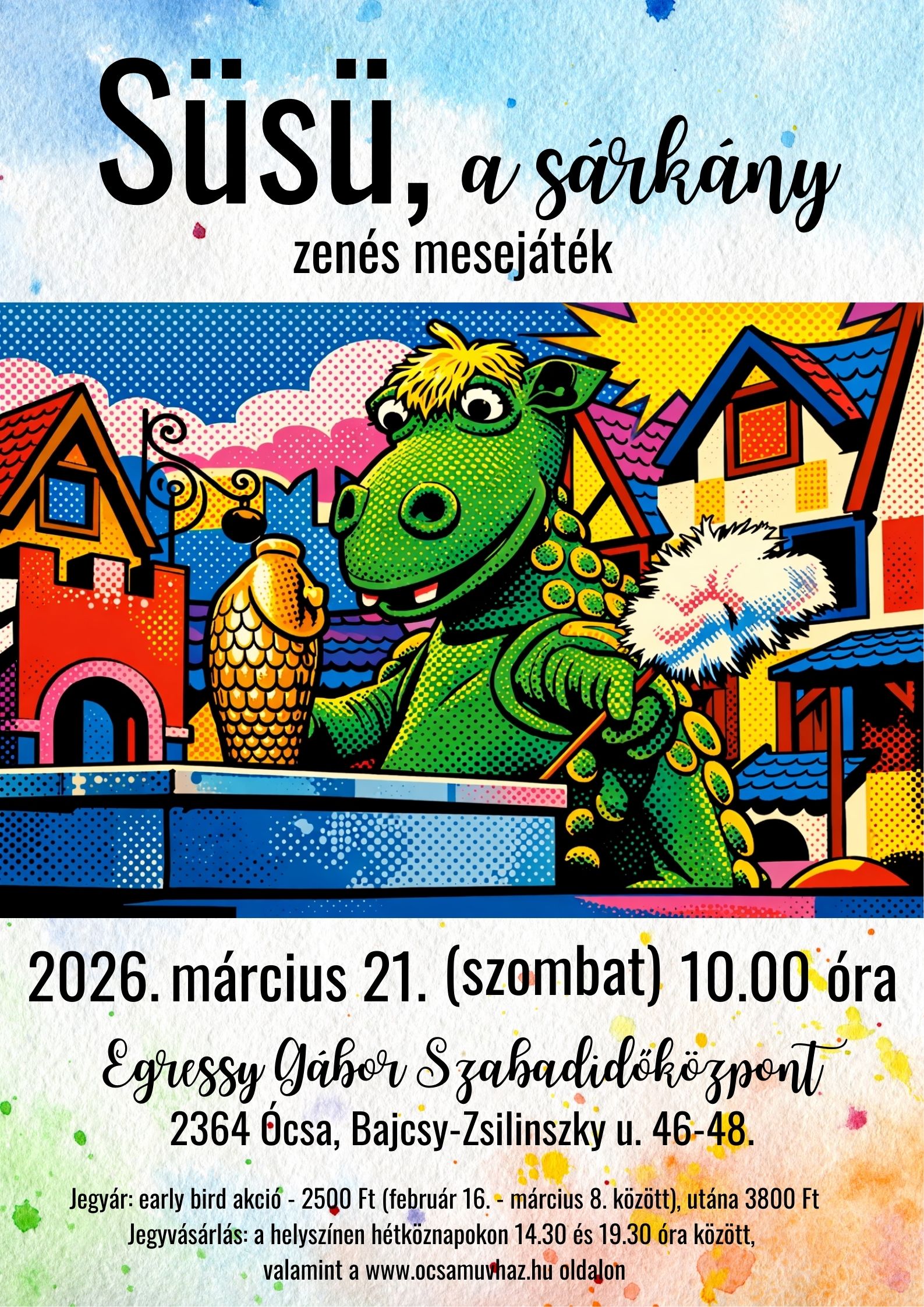 Jegyek megvásárolhatóak személyesen a helyszínen hétköznaponként 14.30-19.30 óra között vagy online: https://ocsamuvhaz.jegy.hu/.../susu-a-sarkany-188726/1402934 .